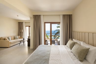 Our spacious 36 m2 suites offer you luxury combined with the amazing views. Stunning views of the Aegean which you can enjoy from your balcony or your terrace complete with coffee tables and chairs. This suite offers a contemporary design with a seating corner, big windows and king size bed for extra comfort. The bathroom features bathtub with bathroom toiletries. Junior suites with sea view can accommodate up to three adults.